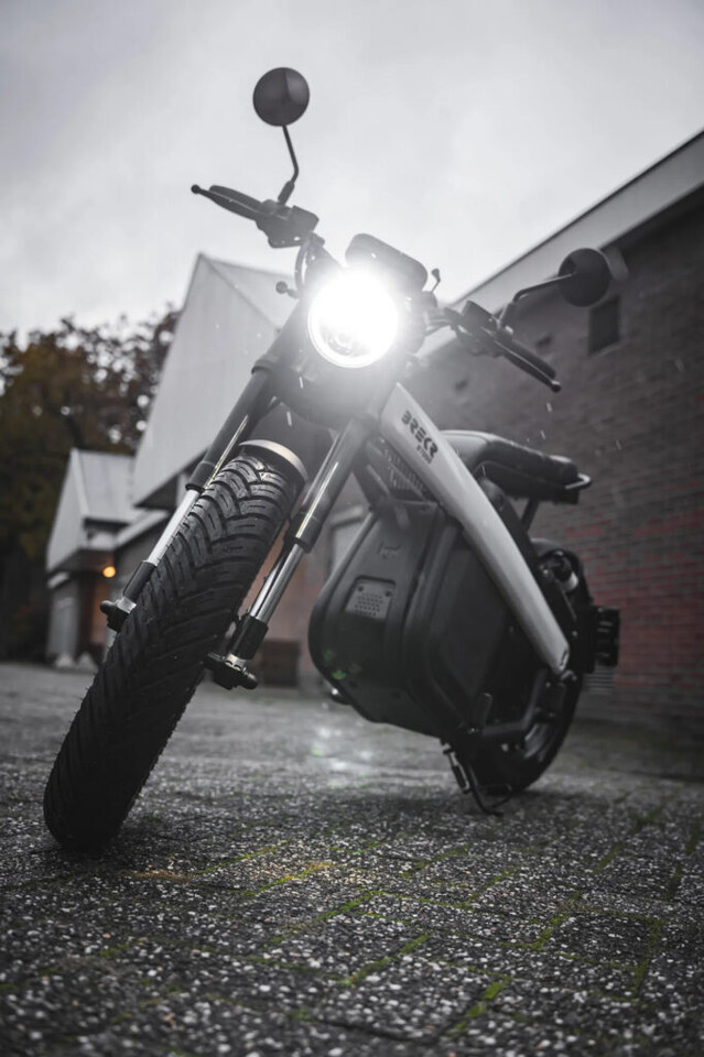 O ciclomotor tem um motor elétrico 7 000 watts integrado na roda traseira, com uma velocidade máxima limitada a 70 km/h.