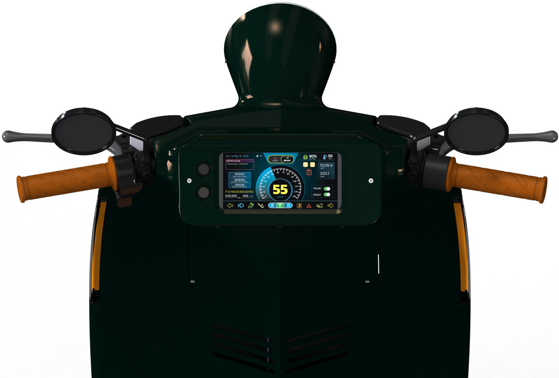 O trotinete é um verdadeiro trotinete inteligente e oferece um ecrã tátil de 6" com o sistema operativo Google Android e aplicações para trotinete. O painel de instrumentos fornece acesso a navegação GPS, GSM, conectividade 3G/4G, bluetooth e WiFi.