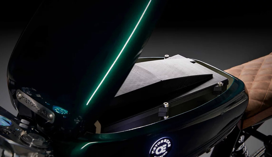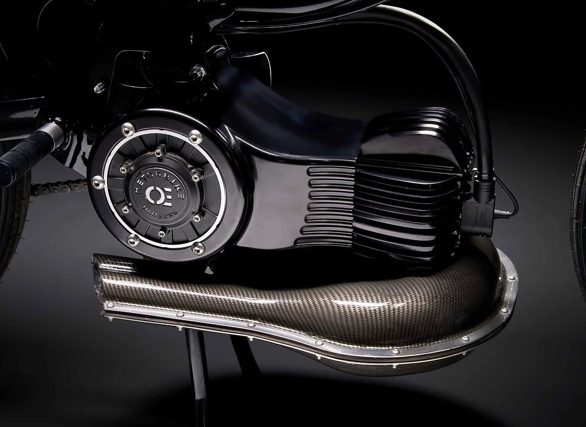 A Metorbike tem um potente motor elétrico 7 000 watts com um sistema acústico inovador. O motor está localizado no centro do ciclomotor e tem um visual autêntico. A velocidade máxima do ciclomotor está limitada a 50 km/h.