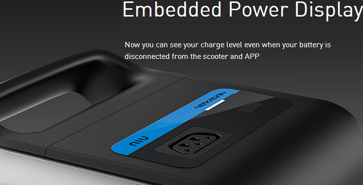 O M1 utiliza uma nova tecnologia de bateria de Lítio desenvolvida pela LG que permite uma autonomia de 100 km com um peso de bateria de apenas 8,3 kg e tempo de carregamento de 360 minutos. A caixa da bateria é fabricada em liga de alumínio com uma pega de transporte fácil. A NIU oferece uma garantia de 2 anos sobre a bateria.