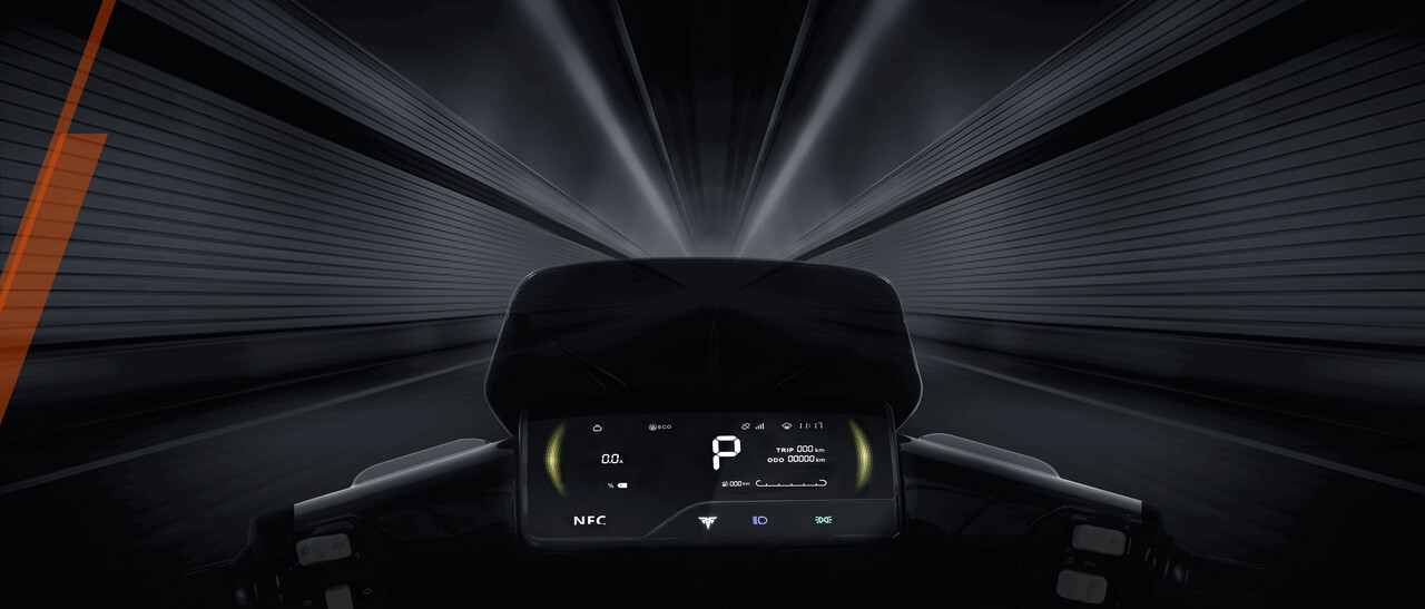 O trotinete possui um painel digital que se conecta a um telemóvel através de NFC e Bluetooth.