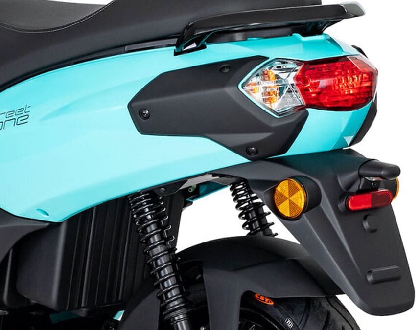 O scooter possui duas baterias removíveis que proporcionam uma autonomia de 112 km. As baterias suportam carregamento rápido.