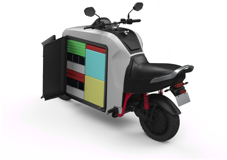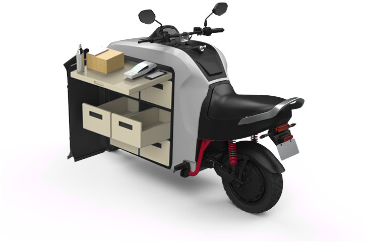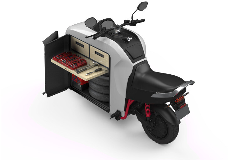 A trotinete tem um motor elétrico potente de 3 400 watts (6 000 watts de potência de pico) na roda traseira que proporciona uma capacidade de carga de 150 kg no compartimento de armazenamento central 225 litro.