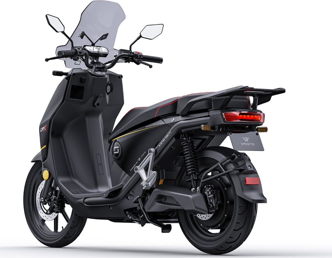 O motor elétrico com braço oscilante é uma inovação única que permite trocar o aro e pneu traseiro em menos de 5 segundos, tornando a trotinete adequada para corridas profissionais de trotinetes elétricas.A parte traseira da trotinete possui um porta-bagagens em aço carbono compatível com caixas de carga.
