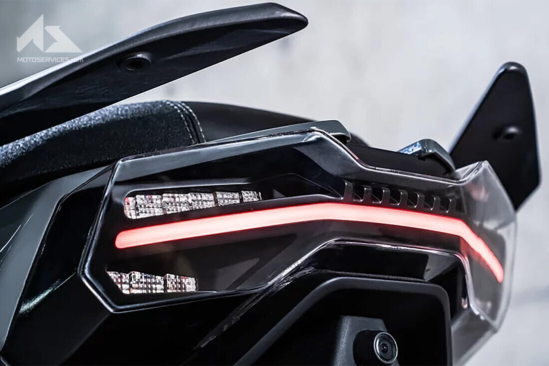 A scooter está equipada com várias inovações e características únicas, incluindo ABS dianteiro e traseiro com travões de disco de pinça dupla, amortecedores hidráulicos, distribuição de peso 50:50 entre a frente e a traseira para estabilidade ideal, radar de obstáculos traseiro baseado em câmara de vídeo para estacionamento eficiente e seguro, câmaras de deteção dianteiras e traseiras, autenticação por reconhecimento facial, fechadura inteligente NFC e um ecrã digital multifuncional com conectividade Wifi e bluetooth.