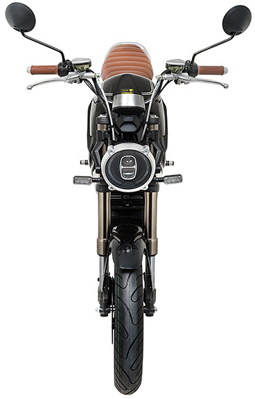 O ciclomotor possui travões de disco de duplo pistão na frente e atrás com sistema de assistência de travagem CBS para um desempenho de travagem potente em qualquer condição meteorológica. O ciclomotor tem uma forquilha dianteira invertida e pneus de duplo composto que proporcionam máxima aderência em curvas.