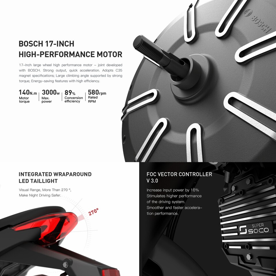 O TSx possui um motor elétrico Bosch de 3 000 watts que proporciona um binário de 140 Nm. O ciclomotor tem 3 velocidades que permitem uma aceleração extra rápida.