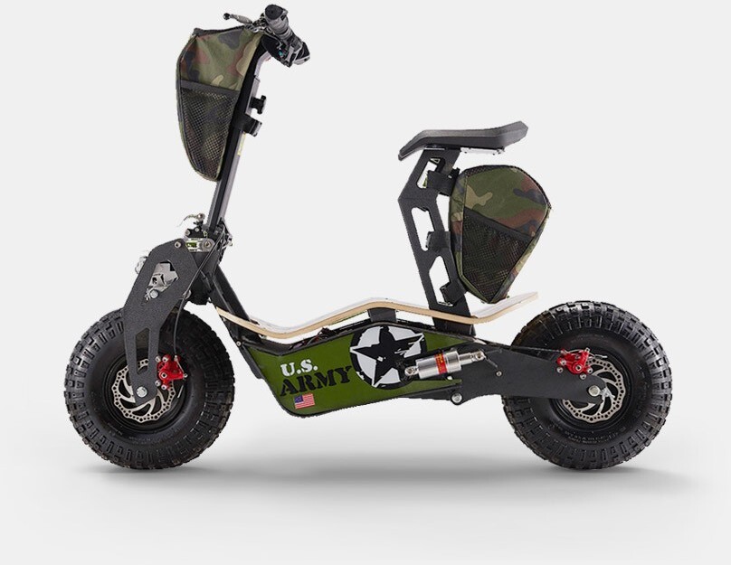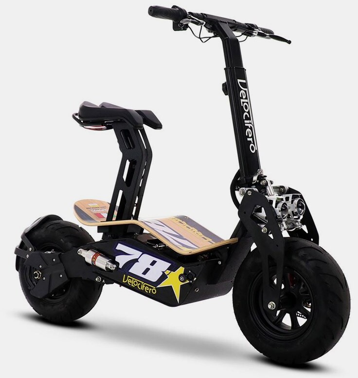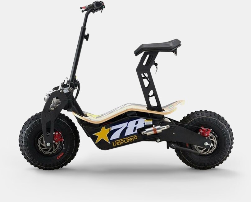 O assento do ciclomotor é removível, transformando-o num patinete de grande porte. O guiador pode ser dobrado.