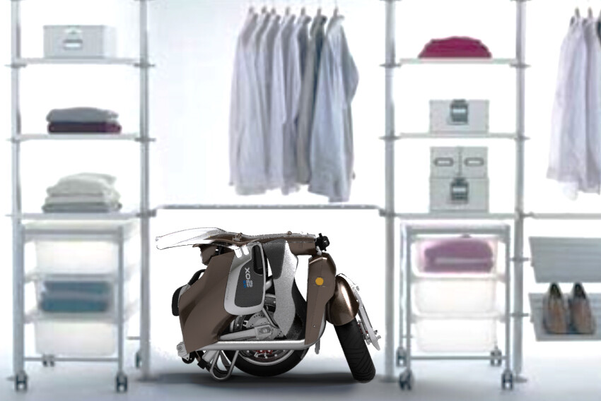 O trotinete pode dobrar e desdobrar em 30 segundos. Em estado dobrado, o trotinete cabe no porta-bagagens de um carro pequeno.